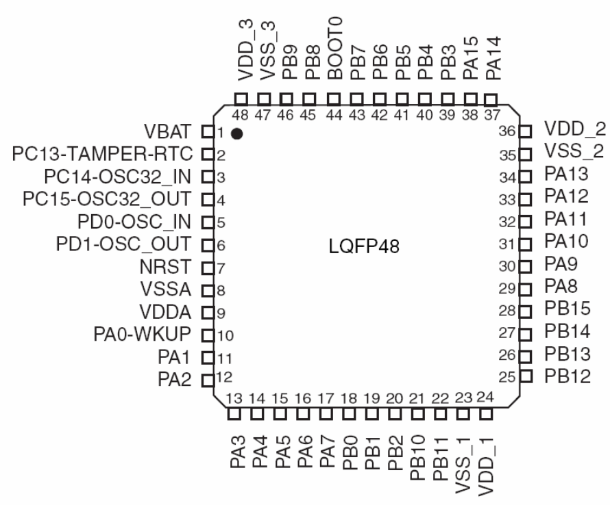 从命名规则可以知道,STM32F103C8T6是STM32基础型单片机,采用LQFP 48 封装,带有64KB的Flash(闪存程序存储器)。其最高工作频率72MHz,20KB的SRAM,2个12位ADC(模数转换器),7通道DMA控制器并支持定时器、ADC、SPI、IIC等,带有7个定时器,多达9个通信接口(2个IIC、3个USART、2个SPI、CAN接口、USB2.0)。下图是其引脚图。