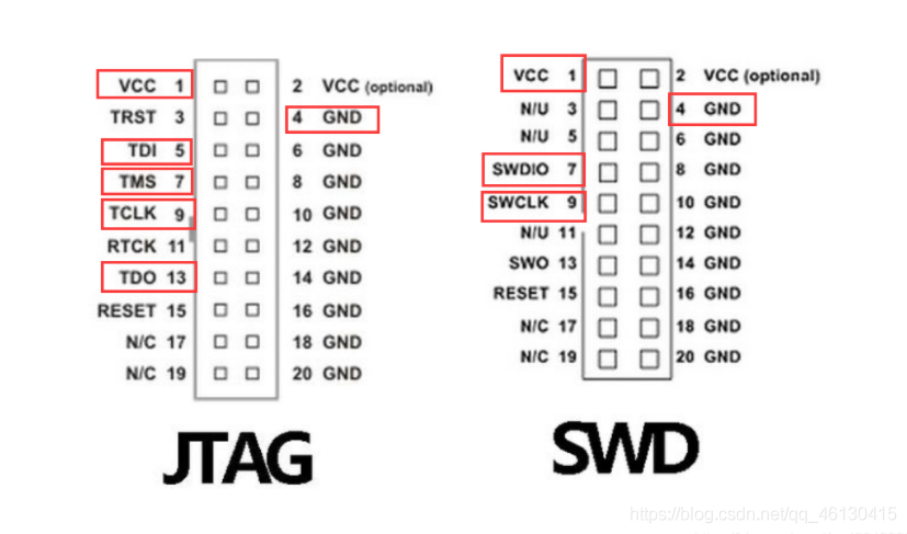 SWD接口即串行调试(SerialWireDebug),是一种和JTAG不同的调试模式,最直接的区别是调试接口上,SWD只需要4(或者5)个引脚:3.3V、GND、SWDIO(PA13)、SWCLK(PA14)。他的SWDIO、SWCLK与JTAG的TMS、TCK复用了。