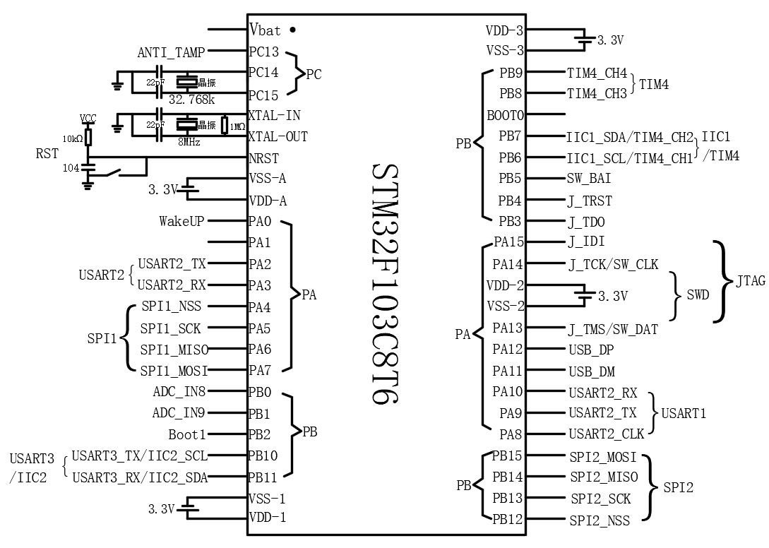 另外一个32.768kHz的低频晶振是用于内部RTC时钟。STM32自带RTC时钟,类似于手机、电脑的系统时钟。不知大家有没有注意过,在我们的手机或者电脑没有联网的时候,重新开机后仍然可以显示时间,其实这就是RTC时钟。原理就是在手机或者电脑主电源断电的情况下,自动启用后备电源(电脑的后备电源就是主板上的纽扣电池),维持RTC时钟晶振工作,以实现主电源断电下也能计时。之所以不采用8M高频晶振作为RTC的振荡源,是因为高频晶振受温度、制作工艺影响大而容易出现误差(RTC的误差就小得多了)。要想使用STM32的RTC,只需要给1号引脚Vbat接一个纽扣电池即可,在未接3.3V电源时,会自动使用纽扣电池供电,接了3.3V电源又会自动切换至3.3V电源供电。因为RTC耗电极低,所以一颗纽扣电池也足够使用很长时间。但是在主电源断电情况下,如果纽扣电池也没电了,内部的时钟时间就会丢失,再次上电就恢复成了初始时间。