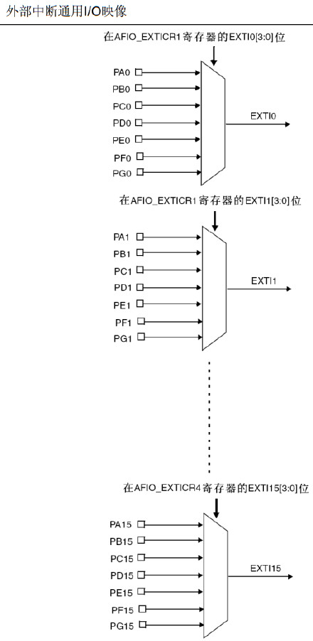 (3)然后GPIO复用功能配置。一般情况下我们使用原始的外设和GPIO端口引脚的映射关系,如果要改变其映射的话,请另外查看参考手册上关于GPIO重映射部分。对于GPIO的复用,其引脚的输入与输出模式都有要求,在参考手册上有详细说明。