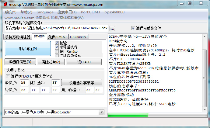 (2)通过这种方法解除内部Flash的读写保护,当然解除读写保护的同时Flash的内容也被自动清除,以防止恶意的软件拷贝。