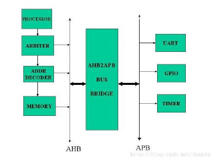 但是,如果设备A和设备B不具有一致性,那么设备A和设备B就必须挂在两条不同的总线上,这时候我们就需要一个“翻译”,把设备A上的总线上的数据和地址转换成设备B可以解析的格式,然后放到设备B的总线上,这个“翻译”就是“Bus Bridge”,下面这幅图就形象的说明了Bus Bridge在AHB和APB之间的作用。