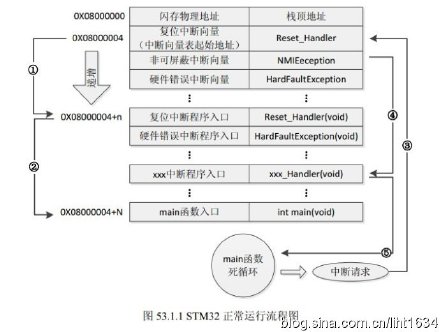 在图53.1.1中,STM32在复位后,先从0X08000004地址取出复位中断向量的地址,并跳转到复位中断服务程序,如图标号所示;在复位中断服务程序执行完之后,会跳转到我们的main函数,如图标号所示;而我们的main函数一般都是一个死循环,在main函数执行过程中,如果收到中断请求(发生重中断),此时STM32强制将PC指针指回中断向量表处,如图标号所示;然后,根据中断源进入相应的中断服务程序,如图标号所示;在执行完中断服务程序以后,程序再次返回main函数执行,如图标号所示。