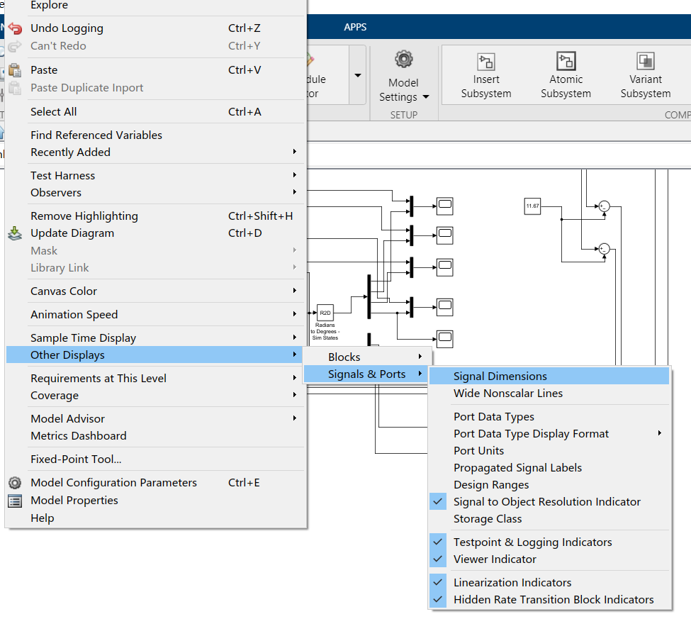 右击other Displays --> Signals & Ports --> Signal Dimensions