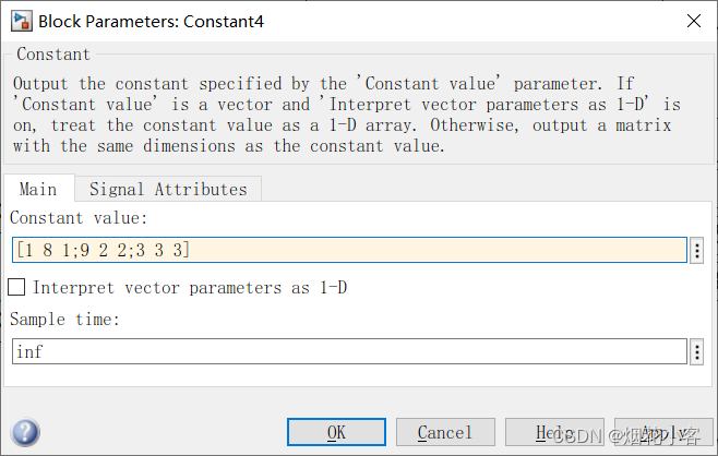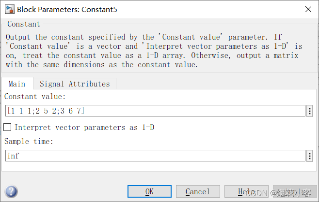 4.sample time = Inf,无穷大采样时间,即不采样,如常数模块。