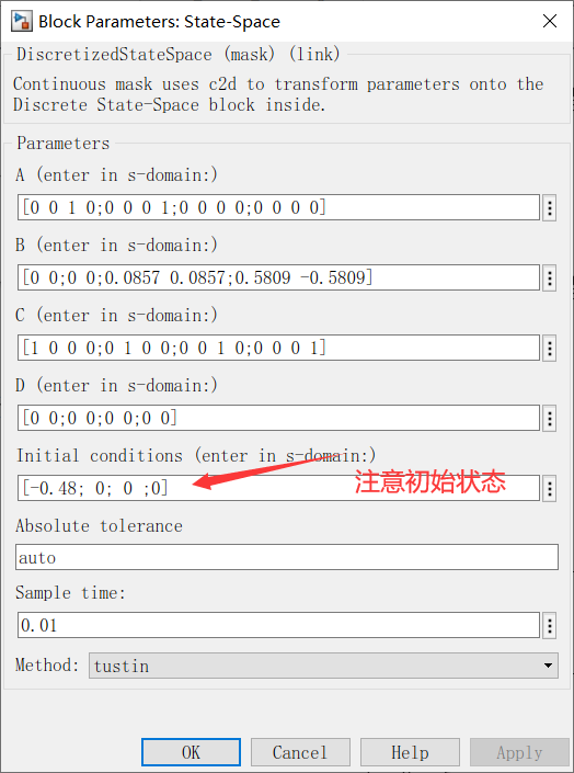 5.还可以在sample time这一栏填入一个包含两个元素的数组[sampletime,offset]。例如填入[0.2,0.01],此时表示采样周期是0.2秒,但是不是从零时刻开始采样的,而是从0.01秒处开始采样的,即采样时间点为:0.01,0.21,0.41等等。