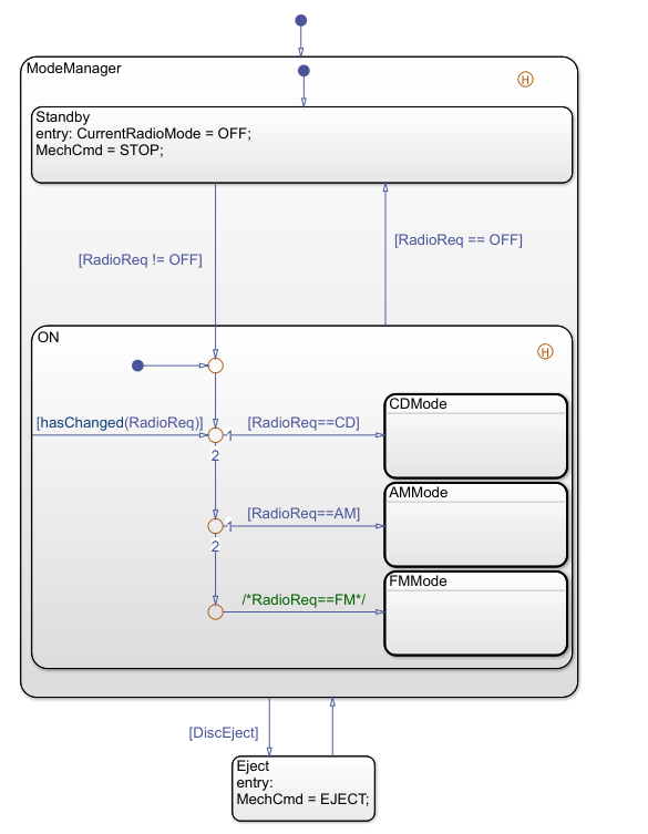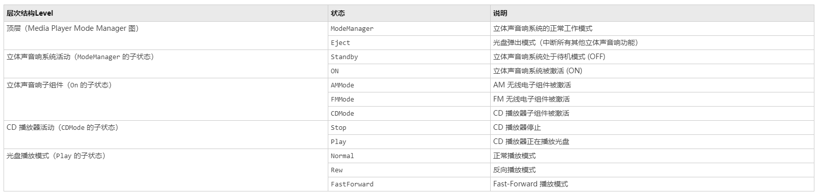 如上,一个CD机有多重功能,就像我们电CD机菜单的时候,一个菜单下面会有子菜单。假如把所有的功能都全部平铺出来,放到一个级别中来演示,那么用户就很难找到自己想要的功能。这些菜单内的功能,体现在模型中,那就是非常多的子子模型,在stateflow中就是非常多的子状态。因此在Stateflow里面,也需要有这种“子菜单”的概念,这样开发的时候才能够更加高效。如下为Simulink demo Model Media Player by Using Enumerated Data中的Stateflow chart,结合前面的说明,相信应该很容易体会到层级结构的作用。
