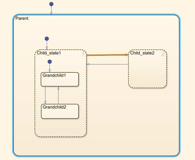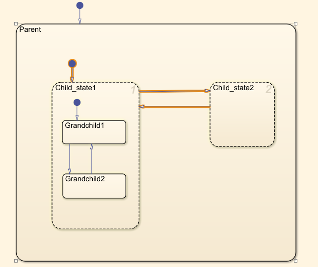 如下图的chart,Child_state1与Child_state2为互斥状态OR,在同一时刻,这两个状态只能执行其中一个: