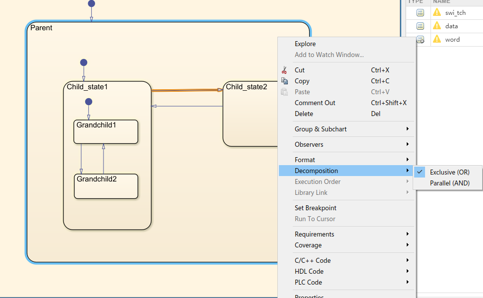 选择父级后点击菜单中decomposition菜单中的orand可以进行互斥与并行的切换,右键父级也可以进行切换:
