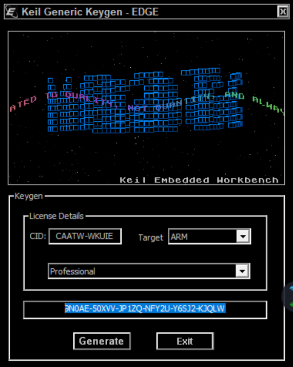 运行第一步的keygen_new2032.exe,将刚刚复制的内容粘贴到CID框,Target选择ARM,下面的下拉框选择Professional,点击Generate