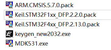 将MDK531.exe、Keil.STM32F4xx_DFP.2.13.0.pack、Keil.STM32F1xx_DFP.2.2.0.pack和keygen_new2032.exe文件复制到自己电脑硬盘里。