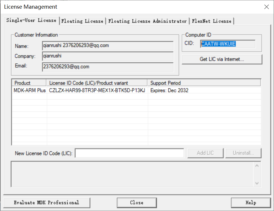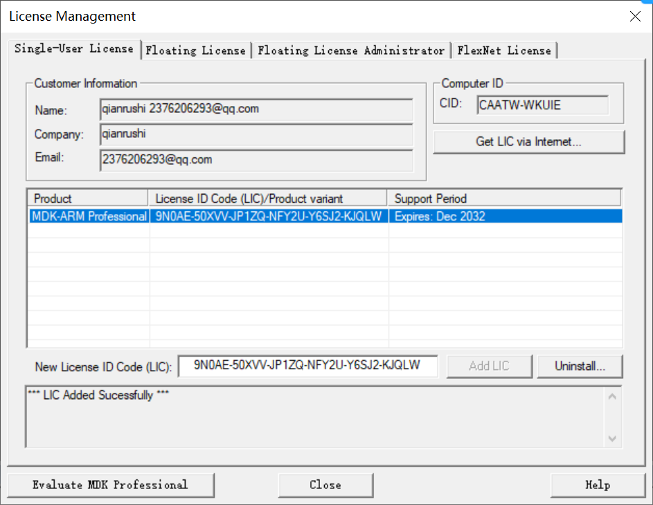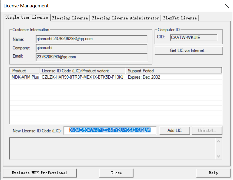 把序列号填入New License ID Code中,点击Add LIC