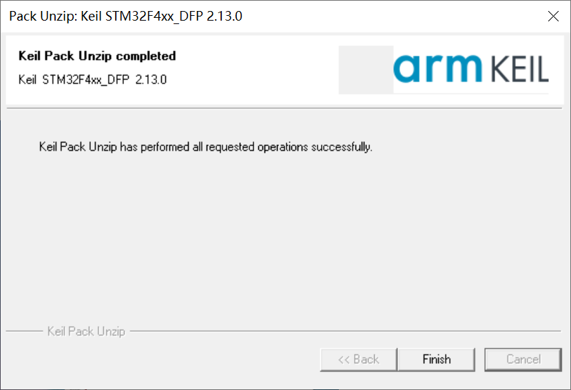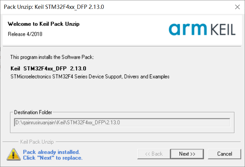 双击运行第一步复制到电脑的Keil.STM32F4xx_DFP.2.13.0.pack 安装F4系列驱动库