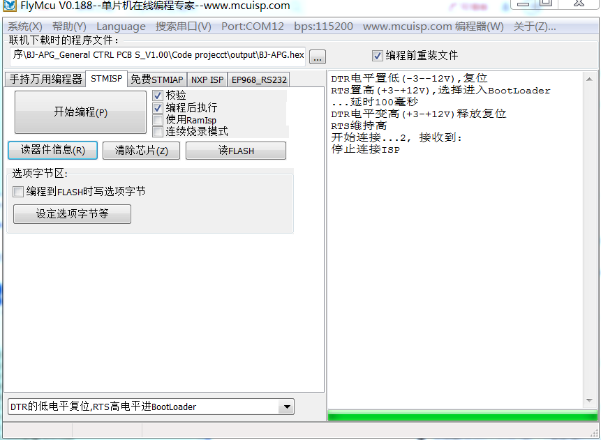 然后,延时100ms后,FlyMcu软件控制DTR为高电平,则DTR#引脚输出低电平,RTS维持高电平,则RTS#引脚继续为低电平,此时STM32的复位引脚,由于Q2不再导通,变为高电平,STM32结束复位,但是BOOT0还是维持为1,从而进入ISP模式,接着mcuisp就可以开始连接STM32,下载代码了,从而实现一键下载。