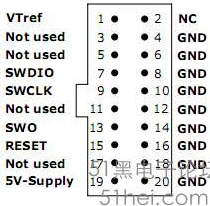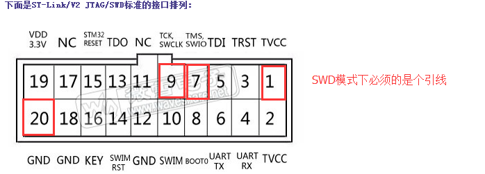 如果用SWD模式下载的话,只需要接:J-LINK的第1脚(VDD)、第7脚(TMS/SWDIO对应stm32的PA13)、第9脚(TCK/SWCLK对应stm32的PA14)、第4.6.8.10.12.14.16.18.20中的任意一个脚(GND地脚)、需要说明的是第15脚(RESET对应stm32的NRST)可接可不接,大家根据实际自己决定(保险起见还是建议接上,不接时可以在MDK仿真器的设置里面不使用硬件复位,而是用system reset或者vect reset)!