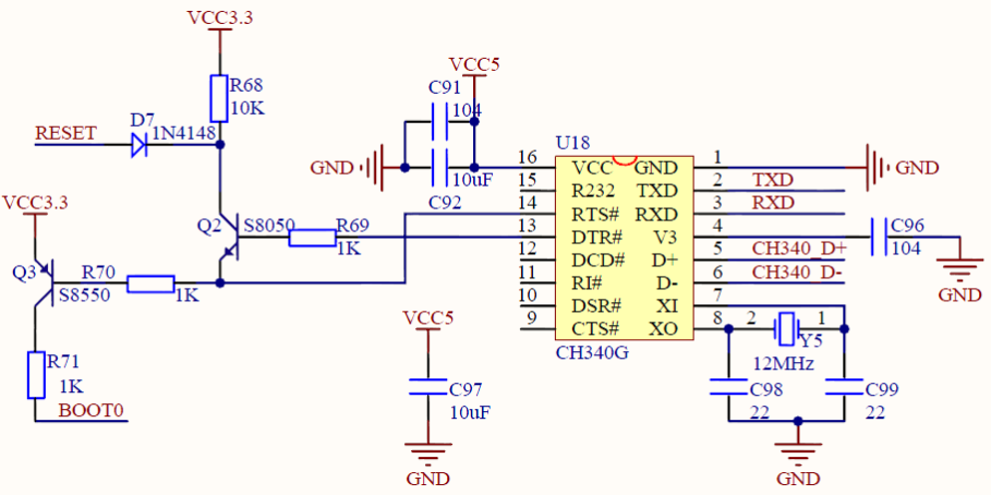 我们想用串口下载代码,就要配置BOOT0为1,BOOT1为0,但是如果想让STM32一复位就运行代码,就要配置BOOT0为0,BOOT1配置为什么都可以,为了解决这个问题,我们可以设计一个电路,通过串口转USB芯片CH340G的DTR#和RTS#引脚的信号来控制一键下载电路,从而间接控制STM32的RESET和BOOT0引脚的信号,来达到通过串口一键下载和运行的效果。