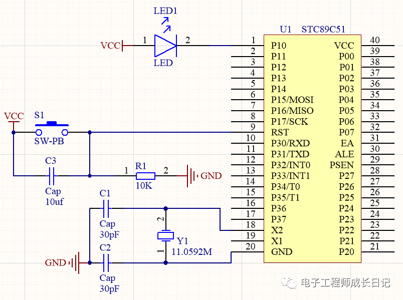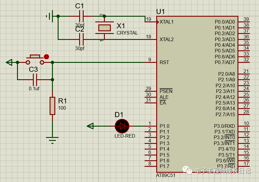 仿真电路图与AD原理图画法一致,但应注意仿真最小系统复位电路中电容值取0.1uf,电阻值取100Ω,与AD原理图中有所区别。