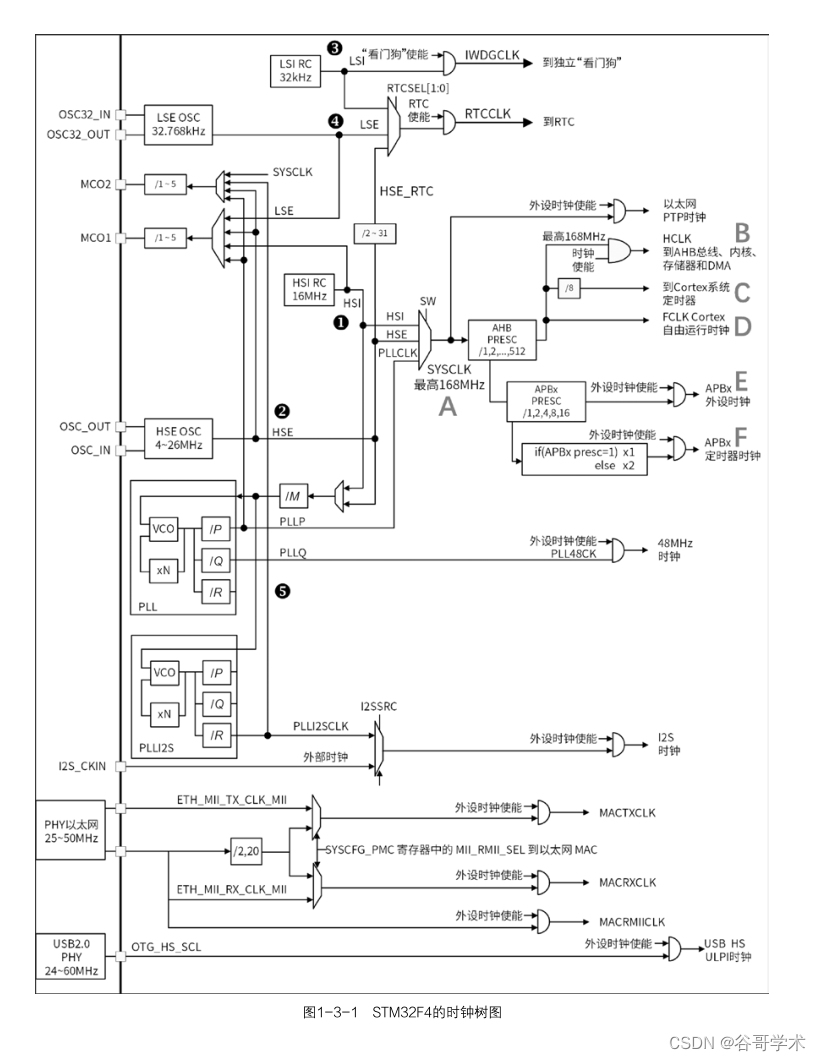 从图 1-3-1 可知,SYSCLK 来源于 PLLCLK。当 HSE 为 8MHz 时,如果要使 PLLCLK 输出