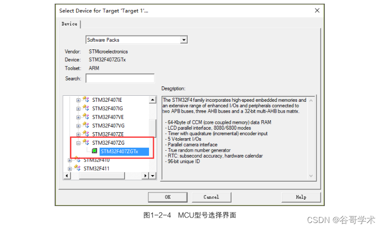 下面以一个具体的 STM32 微控制器型号(STM32F407ZGT6)为例来介绍型号中各部分的