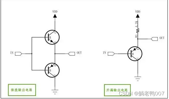 开漏输出:无法真正输出高电平,即高电平时没有驱动能力,需要借助外部上拉电阻完成对外驱动