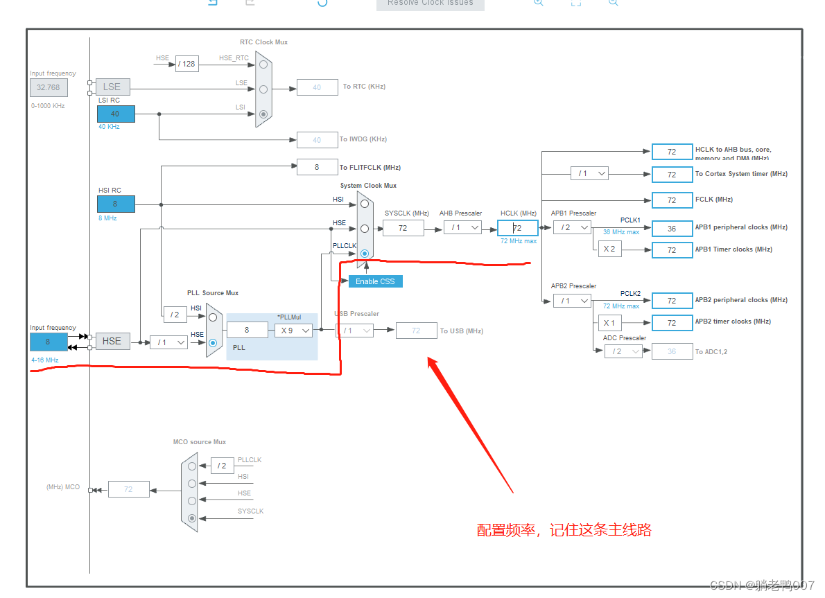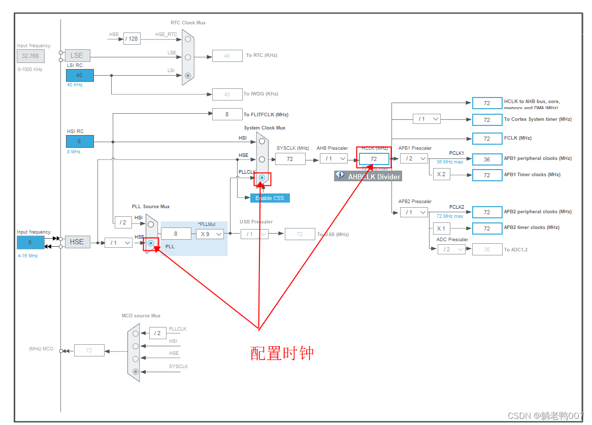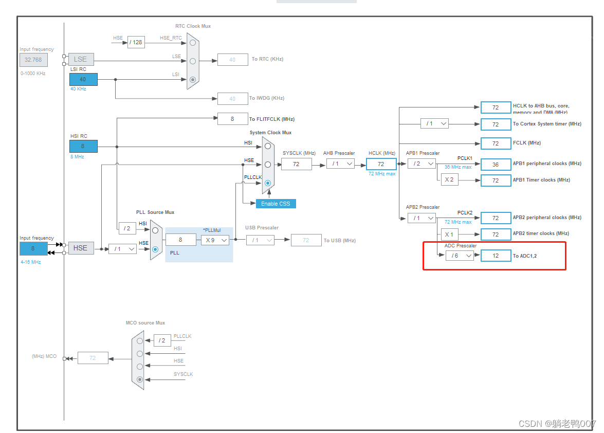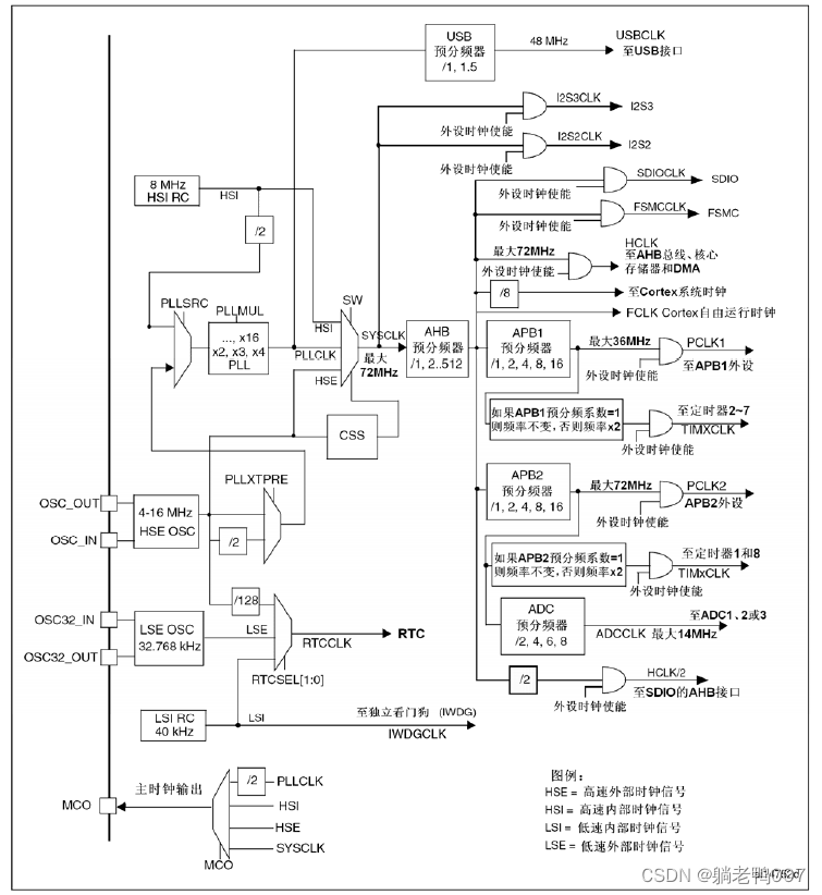 | 系统时钟 | 内部8MHZ时钟HSI最高可倍频到64MHZ,外部8MHZ时钟HSE最高可倍频到72MHZ |