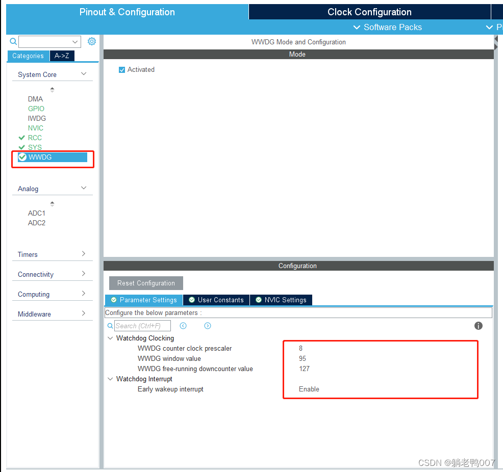 | 看门狗定时器 | 2个看门狗定时器(独立看门狗IWDG、窗口看门狗WWDG) |
