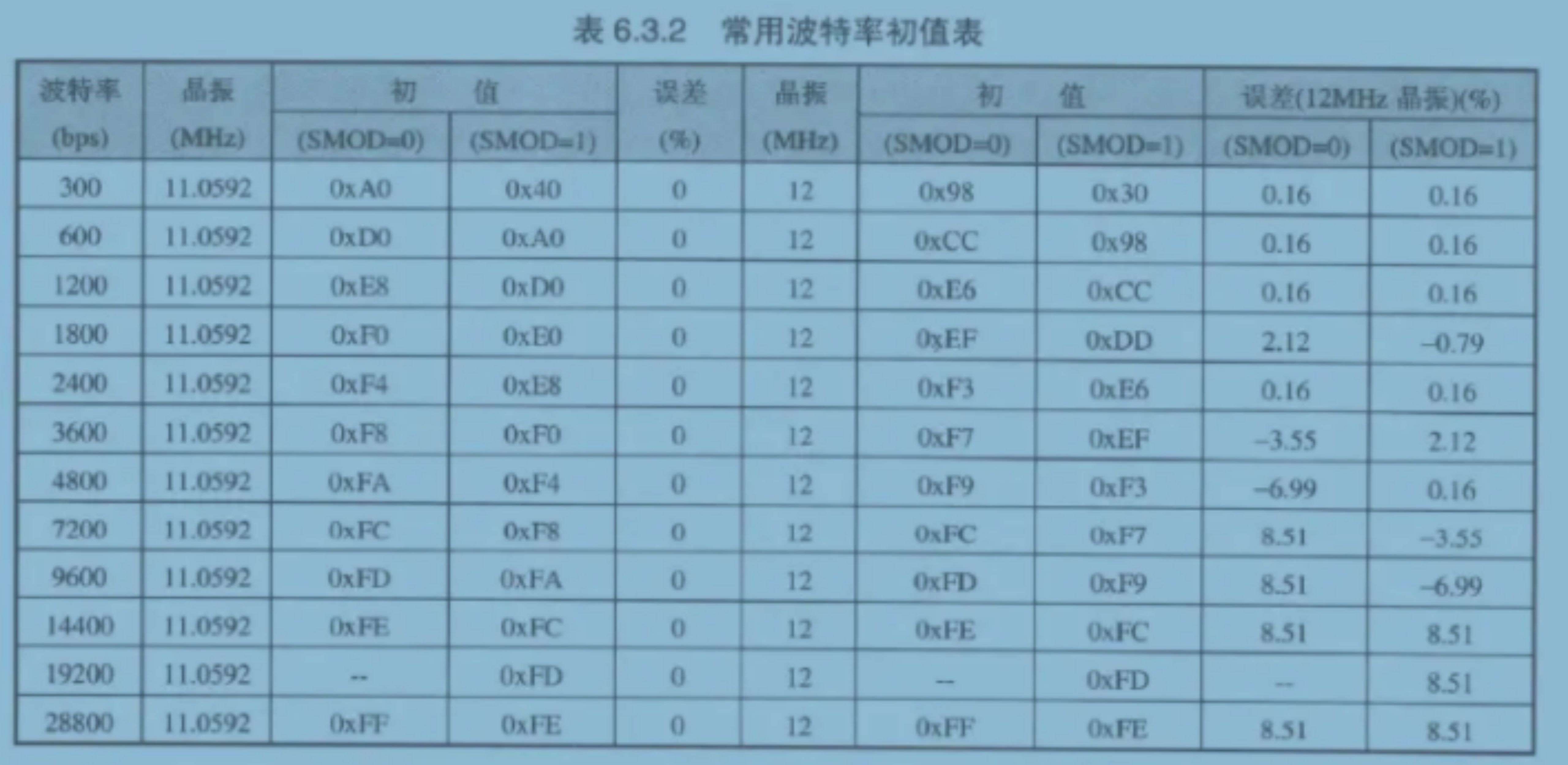 当选用11.0592MHz晶振的时候误差都是0%,也就是说你计算的波特率的误差是0%,但是如果选用12MHz的累计误差在不同波特率的时候也不一样,如果没有特殊的要求,最好就是选11.059MHz晶振,在取波特率的时候通常是取的标称值,在用晶振的时候刚好计算出来T1的定时初值,它是一个非常准确的一个整数,推荐大家做串行通讯的时候要选用这个时钟晶振。