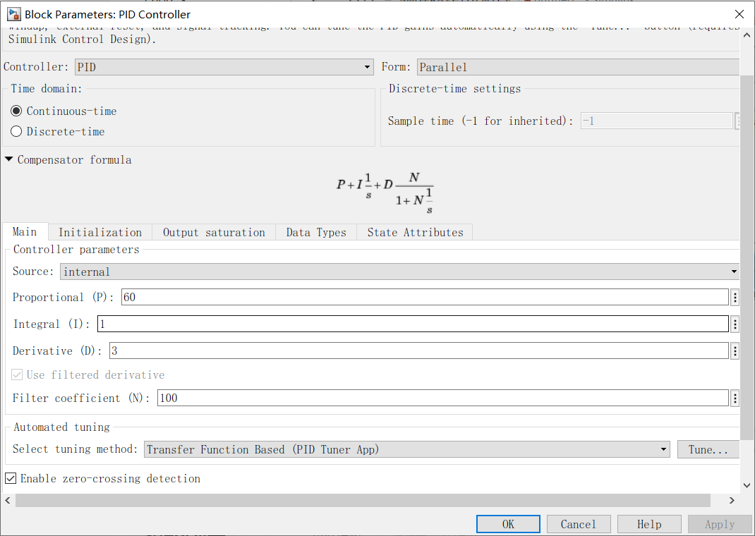 7、双击PID Controller进入PID控制器属性设置界面,根据题目要求设置参数如图所示。