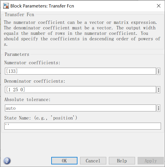 8、双击Transfer Fcn根据题目要求,设置传递函数参数如图所示。