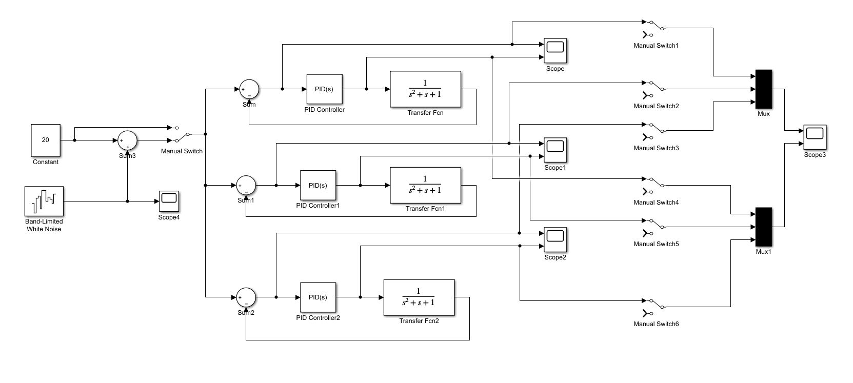 Scope显示的是P控制系统的偏差和经过P控制器处理后的输入,Scope1显示的是PI控制系统的偏差和经过PI控制器处理后的输入,Scope2显示的是PID控制系统的偏差和经过PID控制器处理后的输入,此处加了6个手控开关,即Manual Switch1~ Manual Switch6,当开关拨到上面时依次把 P系统偏差、PI系统偏差 、 PID系统偏差、P系统输入、PI系统输入 、 PID系统输入传递给Scope3进行显示,当某一个开关拨到下面时,即悬空状态,该信号不传输给Scope3,Scope3对该路信号显示为0,这样我们就可以灵活的对三个控制器的性能进行任意组合的比较分析。