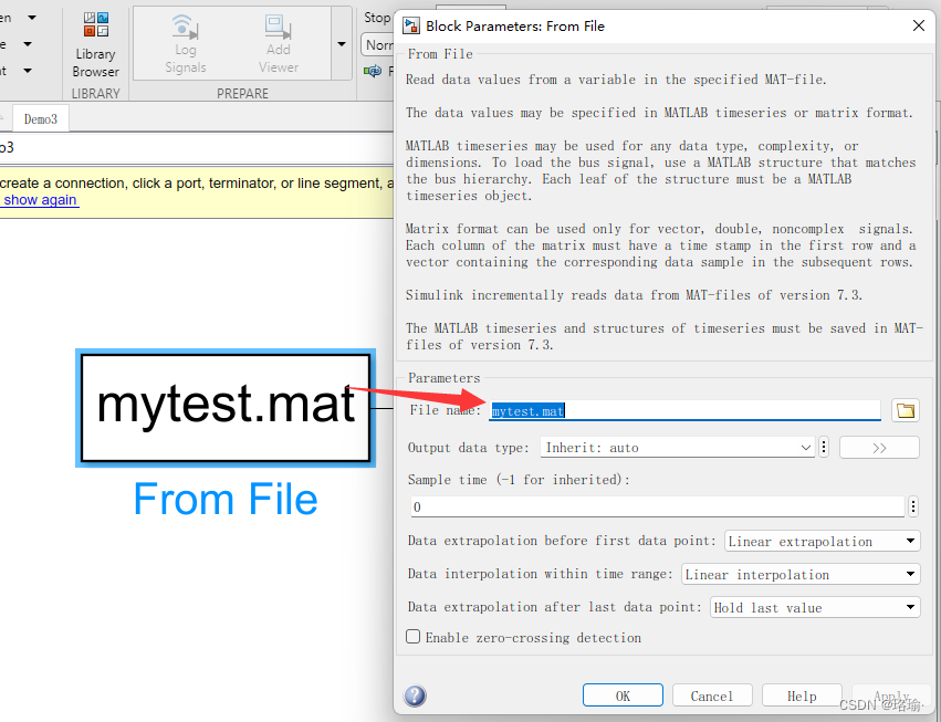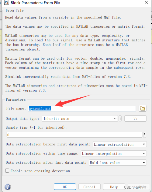 第二步:双击from file模块,将参数配置下的File name名字改为第一步你所存储的文件名字“mytest1.mat”。点击“ok”。