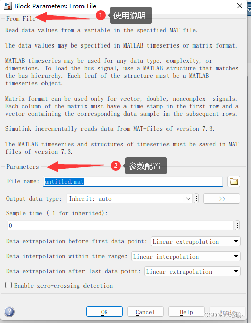 可以指定模块如何从文件中的数据构造输出,包括输出的采样时间、内插和外插行为,以及是否使用过零检测。