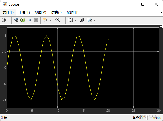 第三步:在simulink浏览器输入“Scope”,将该模块拖入模型,与From file模块连接。接着,点击“Run”;运行后,会出现下图中的正弦波形图。