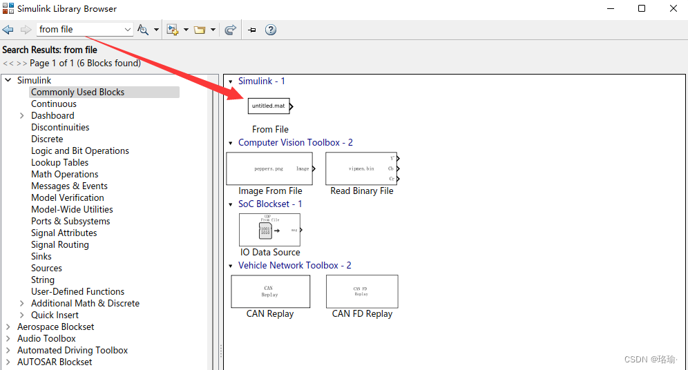 打开simulink浏览器后,在下图搜索框输入“from file”,点击搜搜按钮,右边会出现与“from file”相关的模块。在这里,我们选择simulink-1下的From File模块。