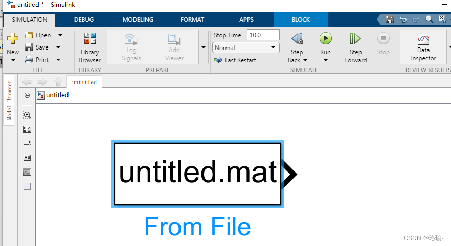 按住鼠标左键,将From File模块拖入到第一节提到的simulink模型中。如下如所示,可以正常使用该模块。