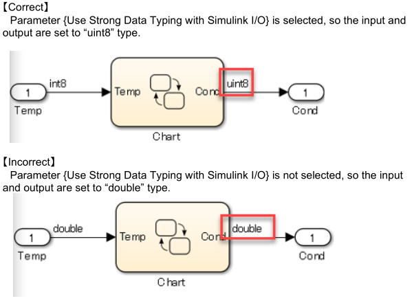 a:当不选中{Use Strong Data Typing with Simulink I/O}时,可以输入输出到[Chart]的Simulink信号数据类型设置为“double”类型。因此,需要在输入之前和输出之后进行类型转换,这增加了块的数量,降低了可读性。
