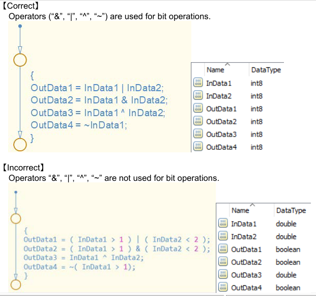 a当这些[图表]属性设置如下:•{Action Language}设置为“MATLAB”•{Action Language}设置为“C”,并且选择了{Enable C-bit operations},“&&&”和“&”、“| |”和“|”时,具有相同的计算功能。然而,当“&&”和“&”或“| |”和“|”组合在同一图表中时,很难确定它们是单独的计算函数还是相同的计算函数。