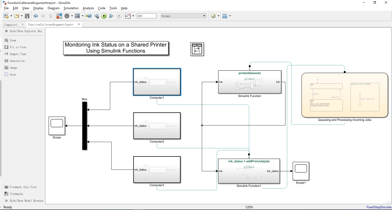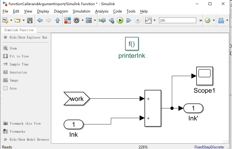 本次学习基于matlab自带示例“slexPrinterExample”,根据matlab官方帮助文档和自己实际搭建模型过程遇到的问题,对Simulink Function 和function caller之间的交互进行一些记录,如果您有更深层次的研究,