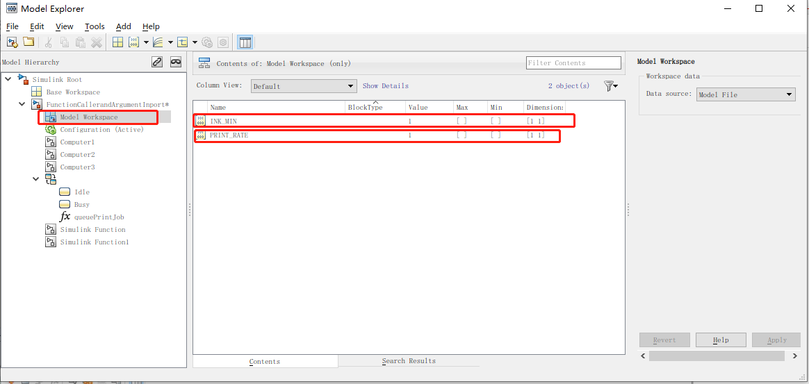 同时两个变量INK_MIN(墨水最小值)和 PRINT_RATE(打印速率)变量的初始值是在 Model Workspace中设置的,两个值为1。