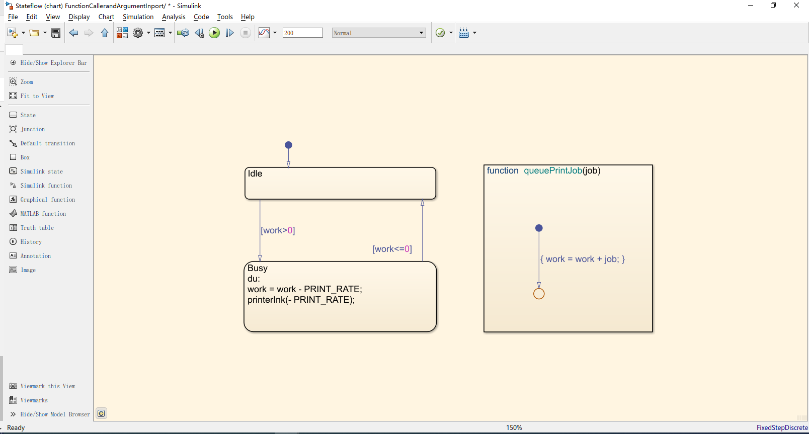 搭建模型过程中注意参数的类型和作用范围,此chart中work的作用域为状态机内,与Simulink Function printerInk函数中输入变量work,同名但是不是一个变量。