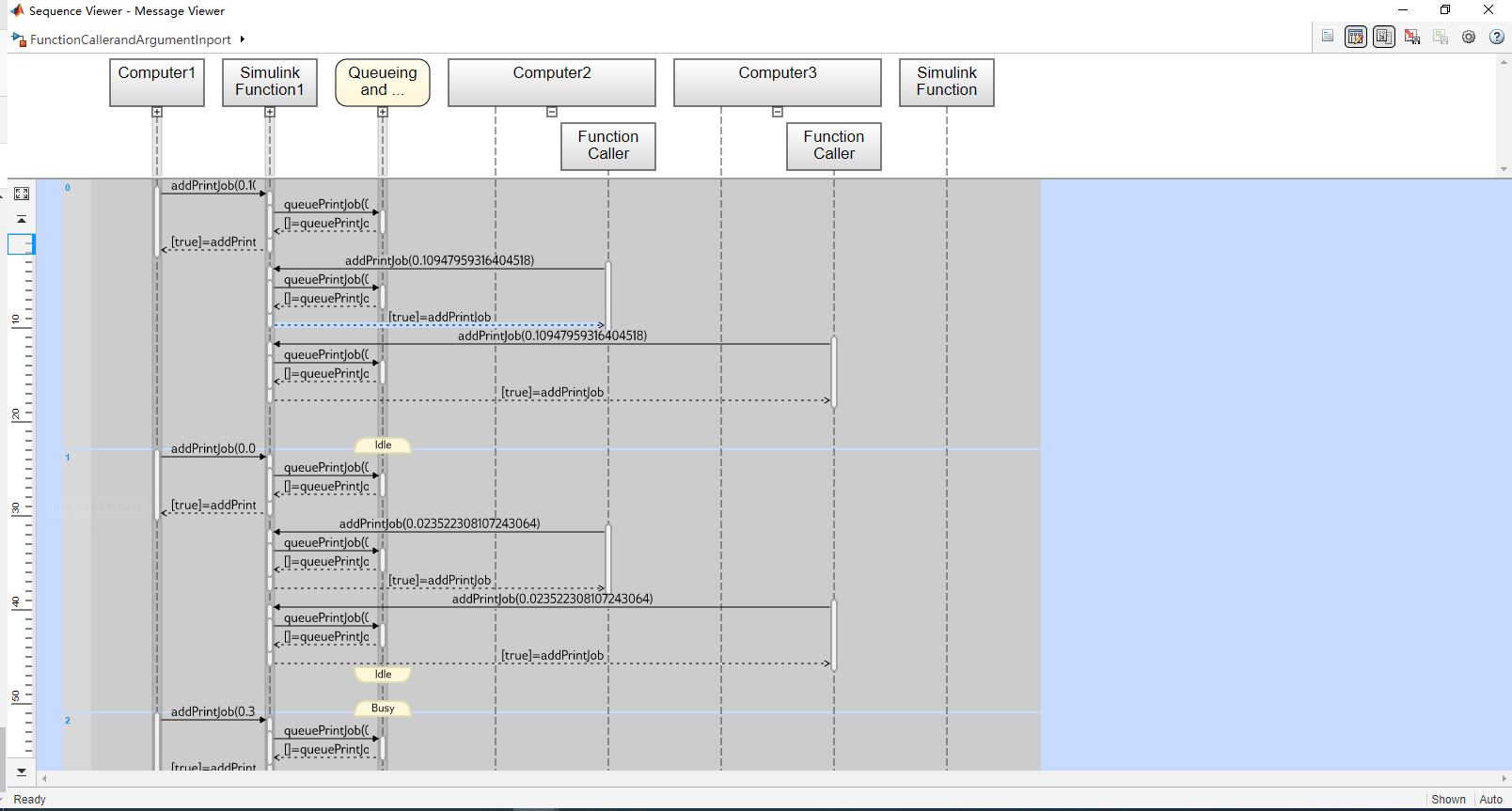 在此示例中,每台计算机均按固定间隔生成随机大小的打印作业。打印机通过Simulink画布上的两个Simulink函数和Stateflow中的一个Exported Graphical Function与计算机进行交互。