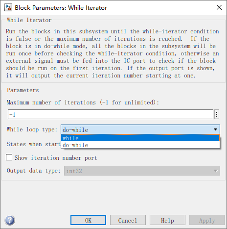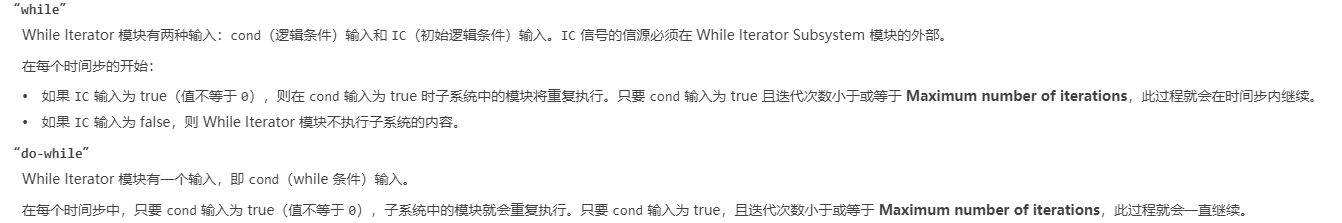 While Iterator Subsystem模块是一个预先配置的 Subsystem模块,可以作为一个起点,用于创建在仿真时间步期间逻辑条件为true时对输入信号的每个元素或子数组重复执行的子系统。其作用基本等效于编程中的while或者是do-while的循环语句。接下来我们来学习一下Simulink中的While语义。