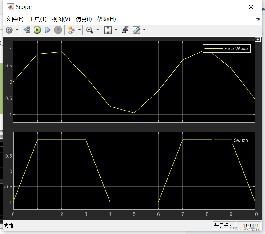 设定了SineWave模块来创建源,Switch模块来进行判断选择。Scope模块来显示相应输出 。