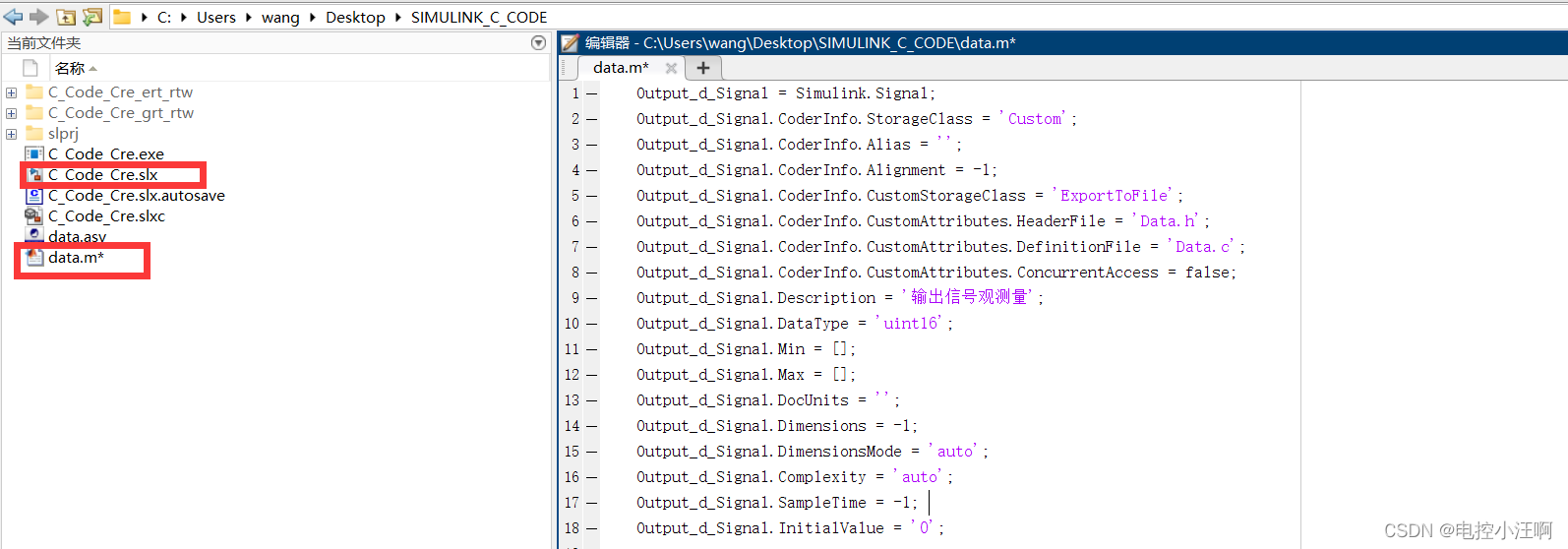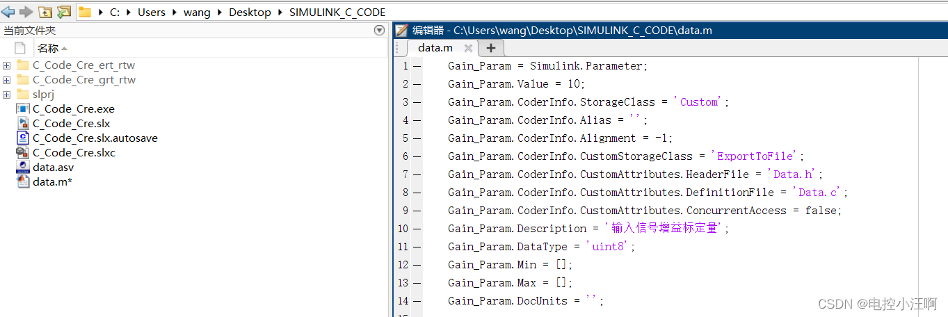 可以发现,设置完之后的两个量,在生成C代码时,在data.c和data.h中分别定义和申明了变量,后续维护时,可直接调用.h文件修改变量或者观测变量,提高代码的可维护性。