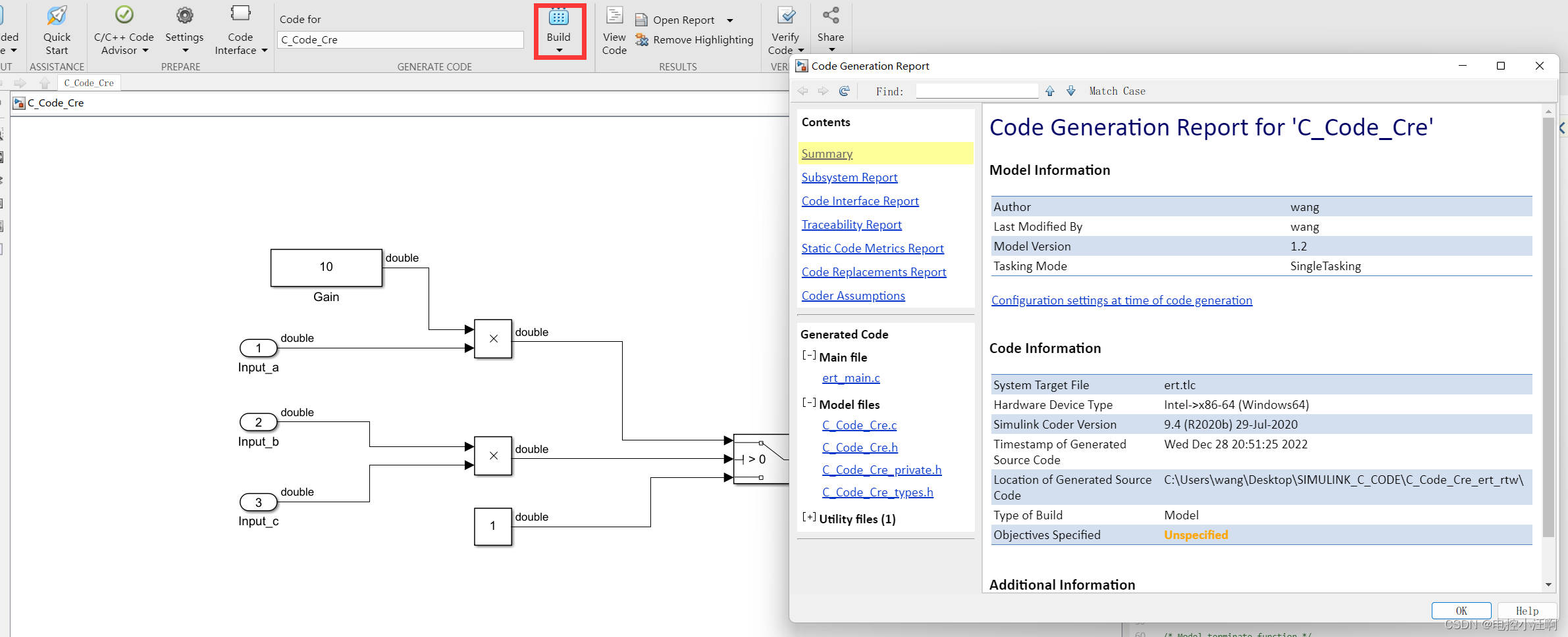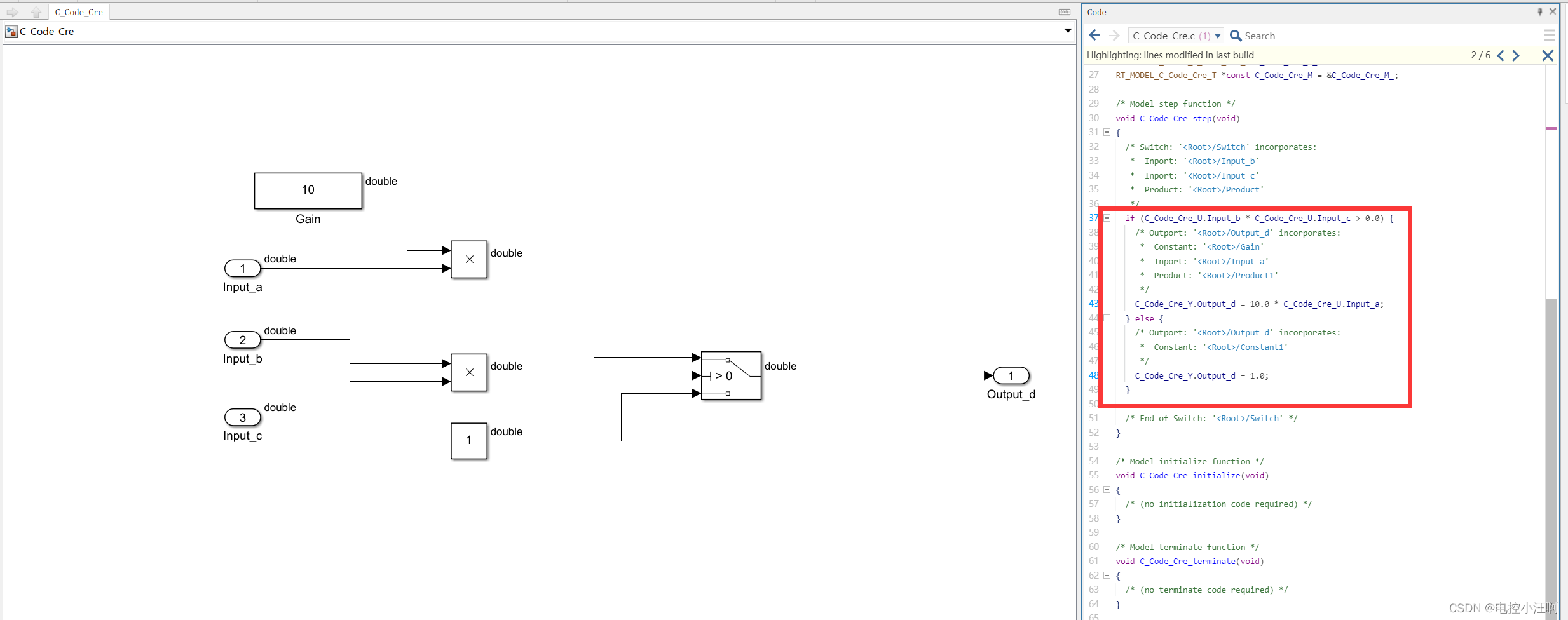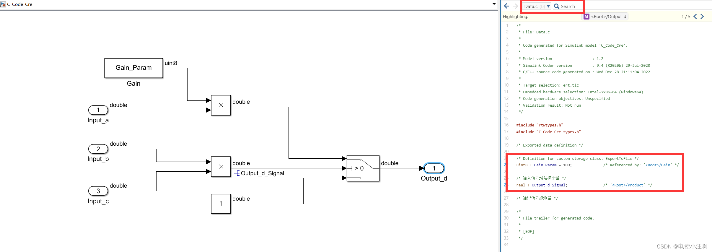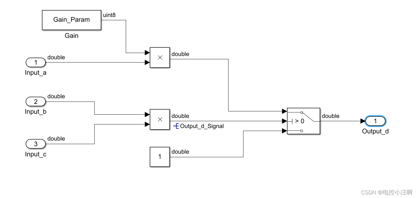 我们发现,在生成C代码时,设置的增益Gain 直接生成为默认给定量,不利于后期更改与标定;计算的中间值也没有生成相应的变量,假设在调试过程中需要观测某些量的变化,则不方便。故在通过模型生成C代码时,需要添加相应的标定量与观测量,便于后期的维护。