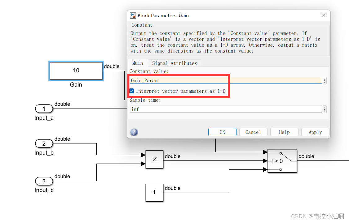1.将需要改为标定量的Gain,双击改为.m文件中申明的变量Gain_Param,并选中Interpret vector parameter as 1-D.