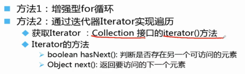 Iterator提供了hasNext()方法:判断集合中是否存在可遍历的元素对象,next()方法:获取集合中可访问的元素对象。