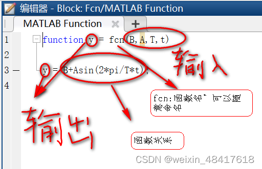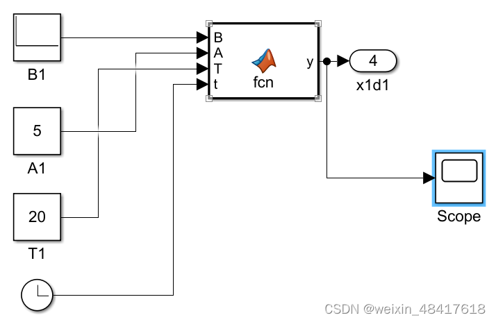 使用mux模型将四个参数聚集起来,从上到下依次为u(1)、u(2)、u(3)、u(4)。在fcn函数中将 B+Asin(2*pi/T*t)书写出来,使用示波器观察。