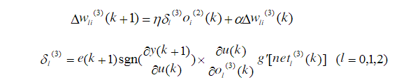 (6)进行神经网络学习,实时自动调整输出层和隐含层的加权系数wli(k)和wij(k),实现PID控制参数的自适应调整