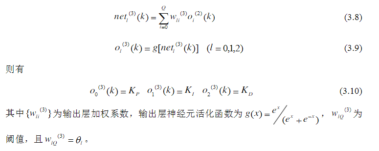 (4)根据上述公式,计算各层神经元的输入、输出,神经网络输出层即为PID控制器的三个可调参数Kp、Ki和Kd